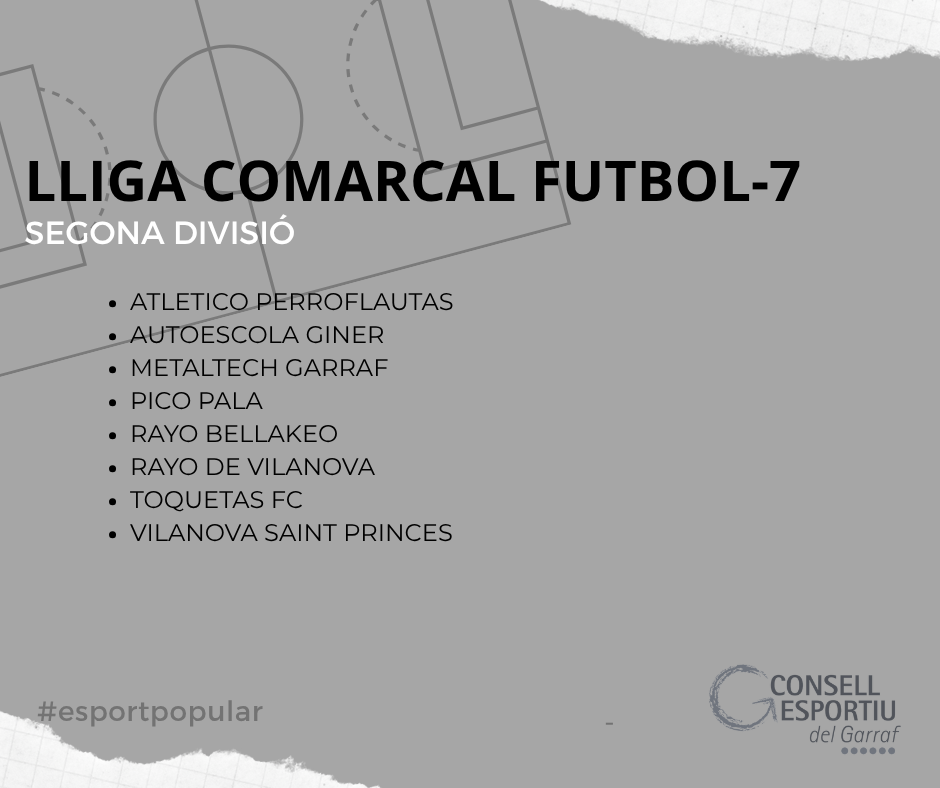 La LLIGA COMARCAL FUTBOL-7, organitzada pel Consell Esportiu del Garraf, compta amb el suport dels ajuntaments de Canyelles, Cubelles, Olivella, Sant Pere de Ribes, Sitges i Vilanova i la Geltrú així com del Consell Comarcal del Garraf i la Diputació de Barcelona.