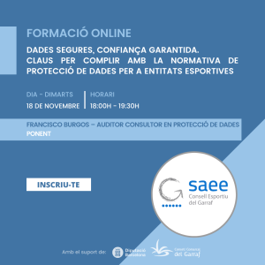 La nova formació del pla formatiu per a entitats esportives del Consell Esportiu del Garraf del curs 2025/2026 porta per nom Dades segures, confiança garantida – Claus per complir amb la normativa de protecció de dades per a entitats esportives.